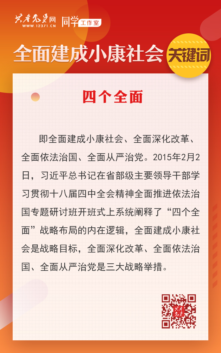 即全面建成小康社会、全面深化改革、全面依法治国、全面从严治党。2015年2月2日,习近平总书记在省部级主要领导干部学习贯彻十八届四中全会精神全面推进依法治国专题研讨班开班式上系统阐释了“四个全面”战略布局的内在逻辑,全面建成小康社会是战略目标,全面深化改革、全面依法治国、全面从严治党是三大战略举措。