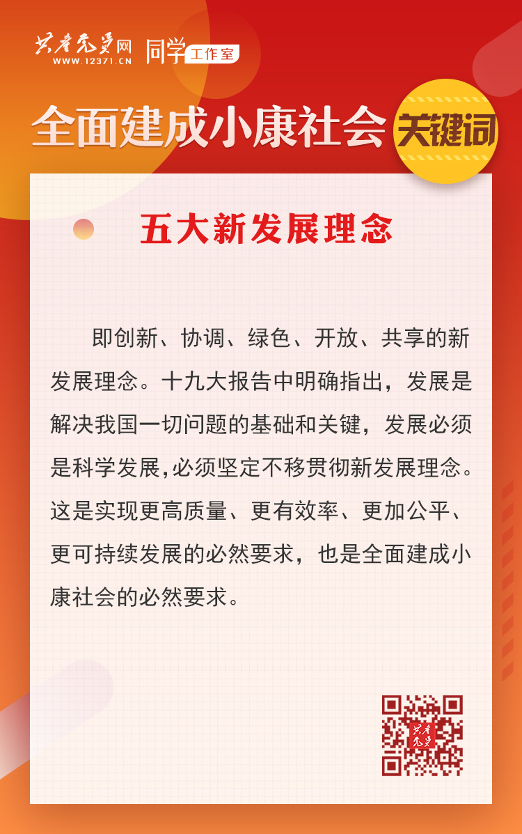 即创新、协调、绿色、开放、共享的新发展理念。十九大报告中明确指出,发展是解决我国一切问题的基础和关键,发展必须是科学发展,必须坚定不移贯彻新发展理念。这是实现更高质量、更有效率、更加公平、更可持续发展的必然要求,也是全面建成小康社会的必然要求。