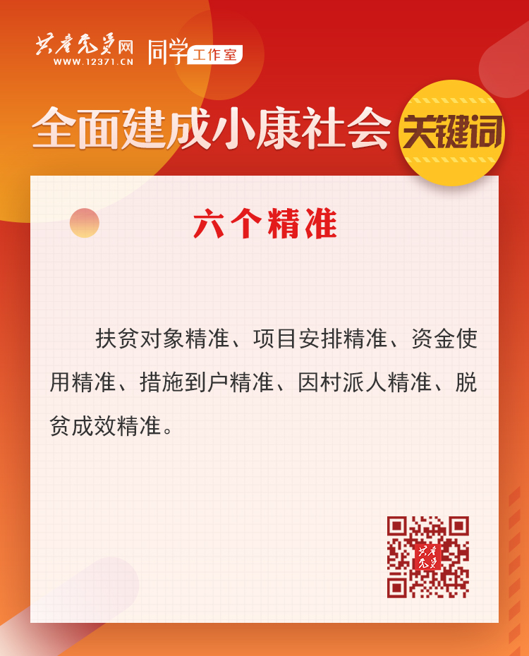 扶贫对象精准、项目安排精准、资金使用精准、措施到户精准、因村派人精准、脱贫成效精准。
