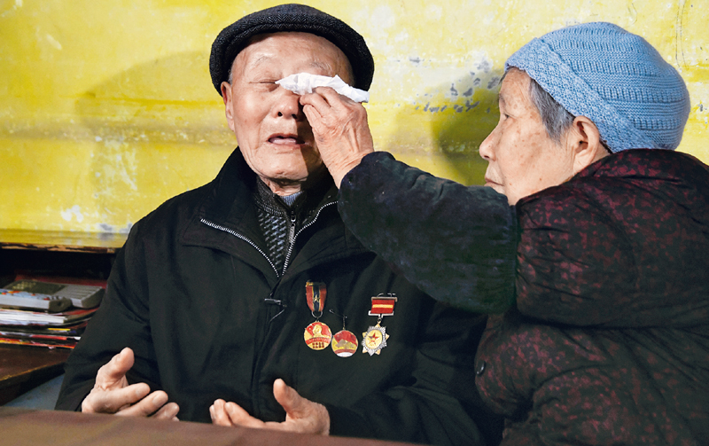 张富清是原西北野战军359旅718团2营6连战士,在解放战争的枪林弹雨中九死一生,先后荣立一等功三次、二等功一次,被西北野战军记“特等功”,两次获得“战斗英雄”荣誉称号。1955年,张富清退役转业到湖北省最偏远的来凤县工作,为贫困山区奉献了一生。张富清用自己的朴实纯粹、淡泊名利书写了共产党人的初心和使命。图为2019年3月,张富清回忆当年并肩作战的战友们牺牲时的情景,不禁泪流满面。 新华社记者 程敏/摄