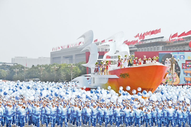 2019年10月1日上午,庆祝中华人民共和国成立70周年大会在北京天安门广场隆重举行。这是群众游行中的“扬帆远航”方阵。 新华社记者 李欣/摄