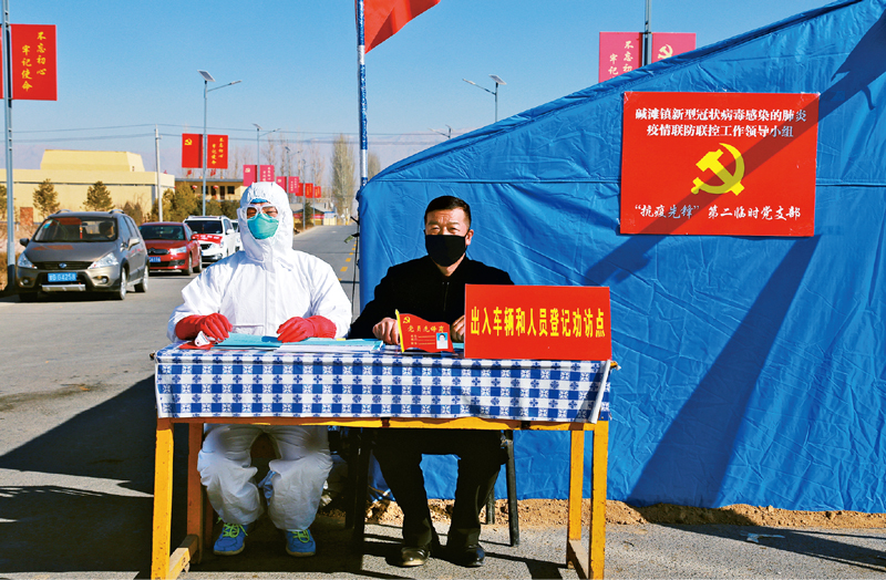 甘肃省张掖市甘州区碱滩镇党委把党支部建在抗疫第一线,成立“抗疫先锋”临时党支部,让党旗在斗争一线高高飘扬,为打赢新冠肺炎疫情提供坚强的组织保障。图为2020年1月30日,党员代表在指挥部出入车辆和人员登记劝访点执勤。 人民图片 成学磊/摄